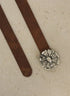 Cinturón de cuero color café con hebilla metálica color plateado. El cuero engrasado se caracteriza por tener un acabado mate con aspecto rústico o envejecido que se realza con el uso.