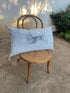 Funda de cojín de lino color celeste con rayas con impresión en serigrafía de conejo.