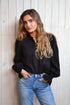 Blusa de manga larga englobada. Cuello alto con vuelo y abertura con botones de nácar. Puños con volante fruncido.